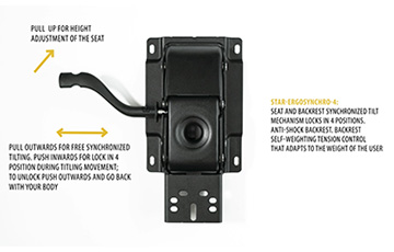 il adopte un nouveau mécanisme de réglage de la hauteur de l'assise et de l'inclinaison du dossier, commandé par un seul levier et capable de mémoriser la forme et la position de l'utilisateur. Le dossier est doté d'un support lombaire réglable qui soutient le dos lorsque l'on se penche pour ramasser un stylo tombé au sol ou que l'on tend la main pour prendre un document sur un autre bureau.