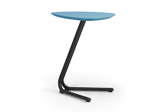 Le plateau de table en MDF (panneau de fibres à densité moyenne) en forme de plectre, revêtu d'une laque polyuréthane texturée disponible en jaune balai RAL 1032, bleu pastel RAL 5024, blanc RAL 9016 ou noir, et le cadre en acier avec tige oblique et base à deux branches peinte en noir, rendent EOS+ très pratique pour être placé devant les chaises sans gêner les jambes des preneurs de notes.
